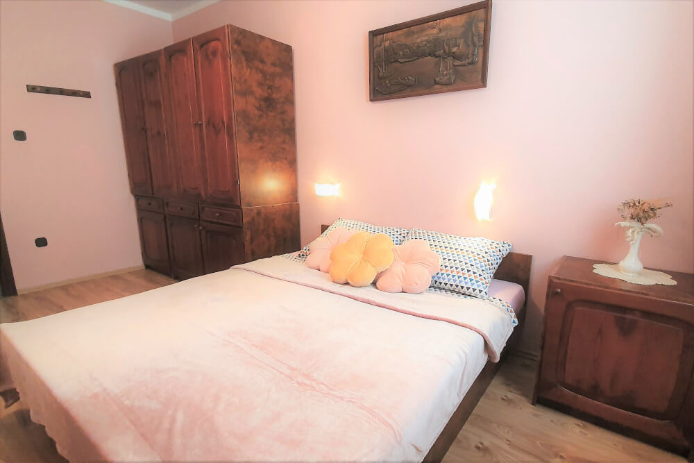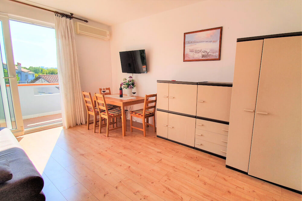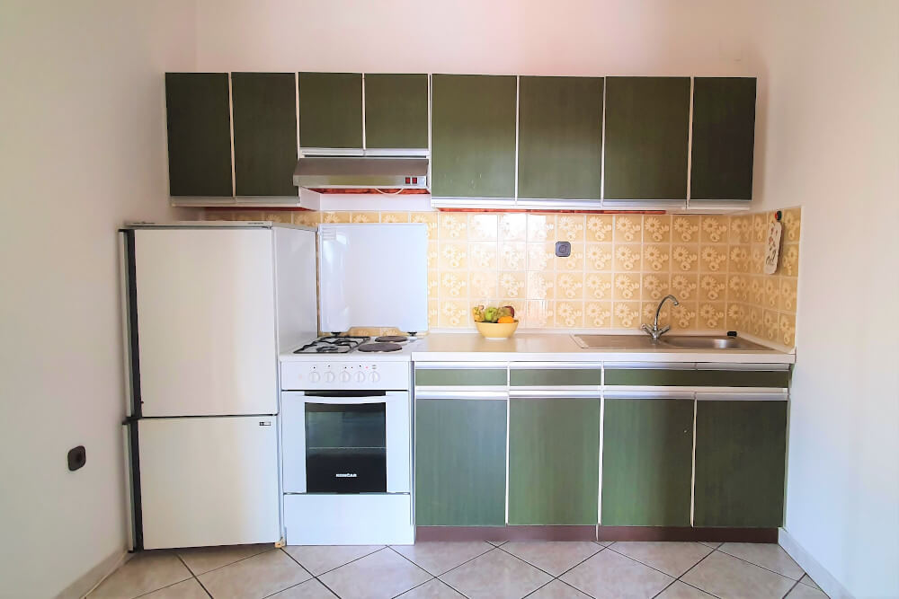 refrigerator, stove, cutlery, utensils, pots, plates, bowls, glasses